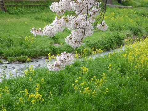 まだお花見に耐えられる程度の花はつけている桜並木ですが、それよりも鮮やかな黄色の菜の花が目立つようになりました。河原を歩いていると、ふわっと漂ってくる菜の花の匂いが、いっそうの春を感じさせます。桜もいいけれど、この菜の花が春から初夏への入り口という感じで、私は気に入っています。桜と菜の花のコントラストが楽しめるのは、ほんの数日しかありません。ひらひらと舞い落ちる花びらは、花筏となってどんどん流れていっていまい、後にはまっ黄色の菜の花が取り残されるのです。葉桜の緑の中の黄色も目を引くものですけれど。