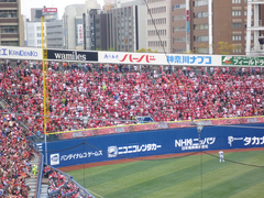 いま勢いのあるチームですから、外野スタンドも元気があります。真っ赤なレフトの見物に行くか……ぐらいの気分だったのですが、あれれ、という間にコツコツ点が積み重なり、終盤はなんと7−0に。それでも1イニングで10点取られることもフツーに起こるチームなので、まったくセーフティリードという感じはしませんでした(^_^;; 近所にいるカープファンが、「山口を出せ〜!」なんて叫んでいるし、ホントに山口が出てきたらどうしよう……とか(笑)