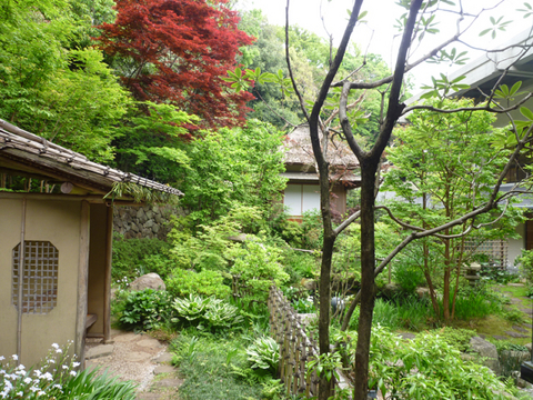 中庭には、今回は使わないという古いわらぶき屋根の茶室が木々の陰にたたずんでいるなど、趣のある風情です。古いために水屋などは使いにくいそうですが、庭をめぐってにじり口から入る構造になっているようで、本当にむかしのイメージの茶室です。こちらも見学してみたかったですねぇ。今回、薄茶席として通された部屋も二間を通しで使っているので広くはありますが、自在鉤でお釜が下げられているなど、なんだか本格的です(^_^;; 古いお寺だけあって、掛け軸とか屏風がとても立派。良し悪しはまったく判別できない私ではありますが、一人前に「なるほど、なるほど」という顔で見物させていただきました(笑) ここでいただいた薄茶はとてもおいしくて、高いお茶を使っているんだろうなぁ〜、とか。こういう感想を下衆の極みと申しますね(笑)