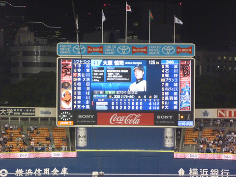 私がいなかったというばかりではなくホームゲームも少なかったので、今日は久しぶりの浜スタ。イニングと時計にご注目って感じです。イニングは8回が終了、時計の針は21時45分という時間を指しています。冗談じゃありませんよ!という感じ(-_-;; なにせプレーボールから3回が終わるまでに1時間半もかかっているのです。双方とも4球がらみの満塁とかエラーとか……、残塁の山で点数はほとんど入らないような、長いだけの退屈なゲームでしたねぇ(笑)