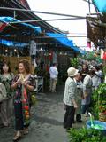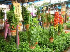 当日は、周辺の道路が車両通行止めになり、道路沿いに緑深い植木鉢や色とりどりの草花を商う露店が立ち並びます。別の一角には縁日にはおなじみの焼きそばやチョコバナナなどの食べ物の露店や水ヨーヨー、金魚すくいなどの店も出ています。昔懐かしいというか、はじめて見たというか、昔スタイルの金魚すくいの露店も見つけました。