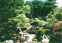 境内には石が敷き詰められていて、ちょうど植木屋さんが手入れ中だったお庭もよく管理されているという印象です。このお庭は夢窓国師が作ったということで有名。 岩に低木、高木が美しく配置されています。