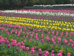 葉桜でもそれなりに美しく、まだ観光客がまばらながら訪れていました。葉桜見物ではなくて、チューリップ見物かも。見事に畝になったチューリップもとてもきれい。隣には水仙の畝もありましたが、これは9割がた終了というところでした。草花の畑には手入れをしている方々の姿が数人あり、参拝客の目を楽しませてくれるための作業に余念がないようです。