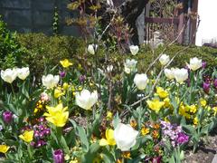 立派な山門も本堂も比較的、新しい感じがするのは、やはり甲府空襲で焼失してしまったのでしょう。あいにく、お寺さんはお留守。庭には鮮やかな色のチューリップをはじめ、春の花がたくさん植えられていました。庫裏の入り口にも色とりどりの花壇が。きっと、花の好きな優しい方が暮らしているのではないかと思わせます。で、ここの境内でお弁当を広げさせていただきました。無断ですけど、お許しください。