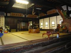 このお寺には文化財がいっぱい。広い境内の左脇には三十番神堂があります。三十番神堂は法華経を守護する三十体の神像を祀る建物だそうですが、明治期の和洋建築。柱や鴨居などに細密な彫刻が施されています。本堂も明 治時代の建築だそうです。珍しい村芝居の回り舞台もありました。いまでも、使っているのでしょうか。