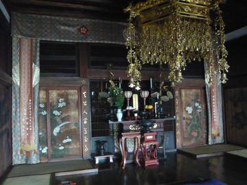 法衣の住職さんがでてきてくださって、本堂にもお参りさせていただき、いろいろご説明もいただきました。本尊は釈迦如来で、座底に1545(天文14)年の銘があり、お寺は鎌倉建長寺の末社としてその頃に創建されたらしいとのこと。2度の火災に会い、1788(天明8)年に諸堂を焼失。現在の堂は1821(文政4)年に完成したものだそうです。本堂の中の杉戸には鳥や花、墨絵の龍などが描かれていて、まるで時代劇の世界へ迷い込んだようです。