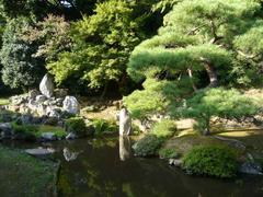 そして、このお寺は桃山時代に造られたとされる流水式池泉観賞蓬莱庭園というのが有名なのですが、これもだらしなくネットが。かぶせられています。全国的にも例の少ない流水式池泉を持つ古庭園として、県指定の名勝となっているということでしたが? 普請中だから……とおっしゃっていましたが、見受けるところ、ずいぶんの期間、放置されているとしか見えないんですけど。