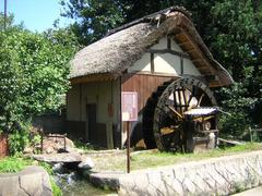 寺域の脇には、涼しそうな水音を立てて、水路が流れています。手は届きませんでしたが、ひょっとしたら飲めるのではと思われるきれい清水です。この辺りは「ころ柿の里ウォーキング 信玄の里コース」というウォーキングコースになっているので、ゆっくり歩いて自然に触れるほうが正解なのでしょう。水路の先には、江戸時代に建てられたという切妻造の水車小屋があり、いまでも軽快なリズムをきざんでいます。