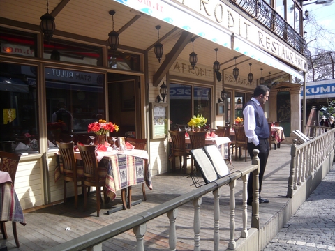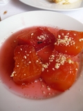 値段の問題なのだろうけど、ちょっと芸がない感じである。デザートはなんだかわからないけど、たぶん、かぼちゃの甘煮のようなもので、トルコのデザートの定番の一つだと思う。とにかく甘そうという気配が漂っていて、一緒のテーブルだった人も私も、まったく手をつけなかった。もったいな〜い。