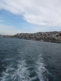 この船はボスポラス海峡の旧市街側を通って新ボスポラス大橋まで行き、新市街側を通って戻ってくる。デッキは風が強くて、ちょっと肌寒い。岸辺に建っているイスタンブールの遺跡や特徴のある建物が次々通り過ぎていく。