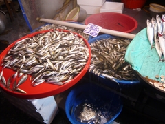 その魚市場を見に行ってみた。とても橋の上からは釣れそうもない大きな魚もたくさんあったが、橋で釣っているのと似たような人相の魚もピチピチと跳ねていた。これなら、バレなくてもすむ? 袋にいっぱい買っている人を何人か見かけたが、ボウズだったのかな。