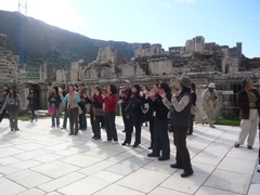 ここへ到着する前、長いバス移動の合間にバシャックさんから劇場で歌をうたいましょうと、練習させられていた。意味不明。「カラオケにでも行こうっていうの?」という感じだったが、練習した成果をここで発表しろというのである。