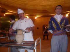 トルコ料理はそんなにインパクトの強い味つけのものは少ないが、ここはみんなとくに薄味。テーブルの上に塩や胡椒、オリーブオイル、粉状の唐辛子のようなもの、ケチャップなどの調味料が並べてあって、自分で味を調整することができる。ここでもデザートはフルーツとライスプディング。ライスプディングのほうは……、ごめんなさい。